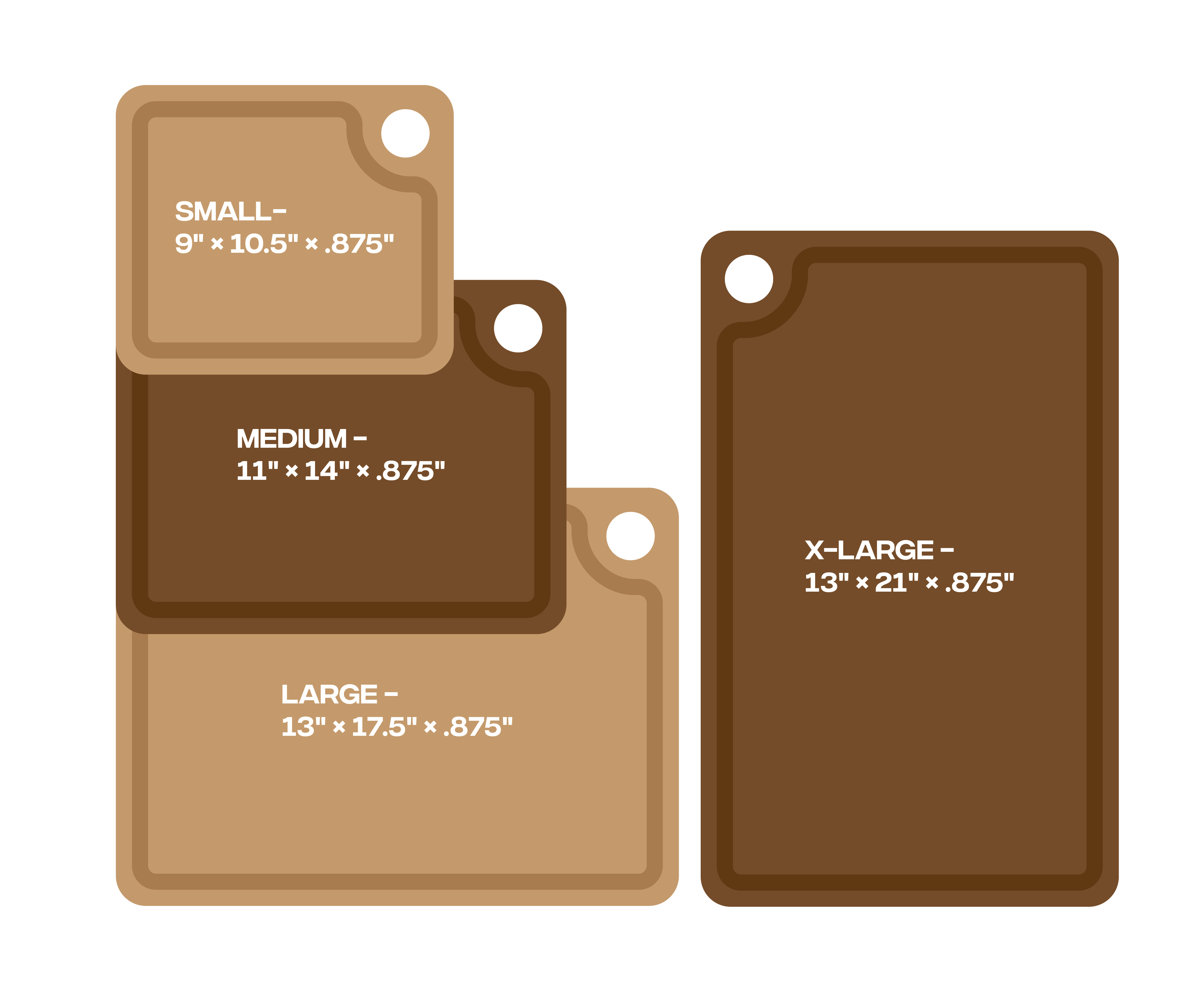 Handcrafted from FSC-certified sustainable solid wood, each board showcases its own naturally unique grain and color variations. Soft rounded edges make the board more comfortable to handle and visually pleasing. The cutting side features a sloped juice groove to catch juices from meats, fruits, and vegetables, keeping your counters clean. It is finished with our homemade coconut-oil and beeswax blend for a smooth, food-safe surface that is always ready for daily use.